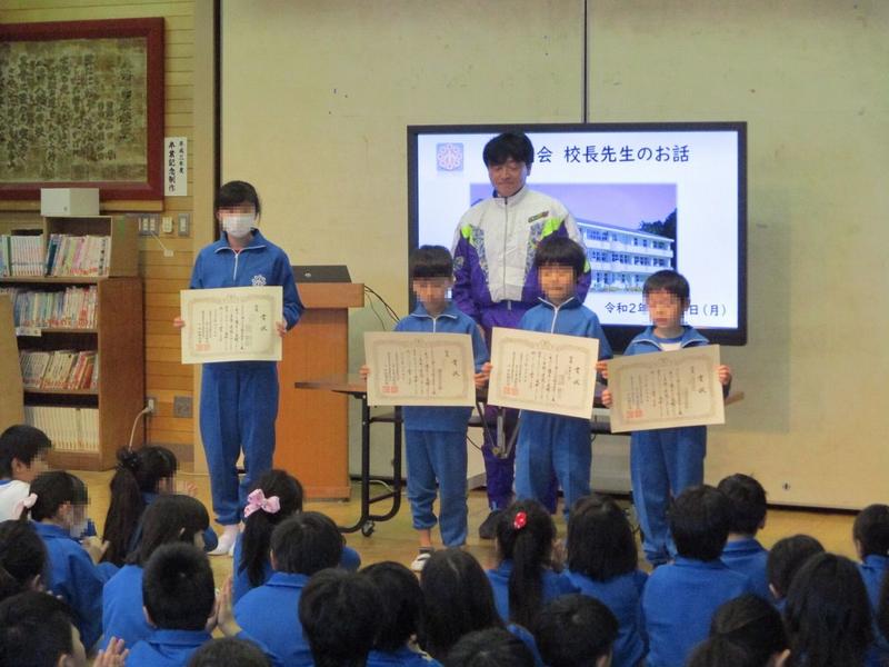 続いて、県の書き初め展の表彰です。特選に選ばれた4名の八幡っ子が代表で表彰されました。いい顔をしています。みんなにご披露!!おめでとう!!