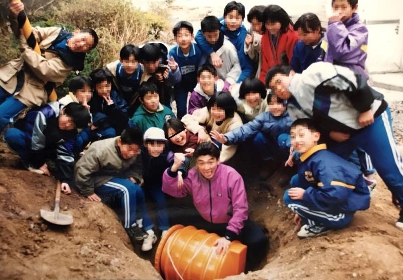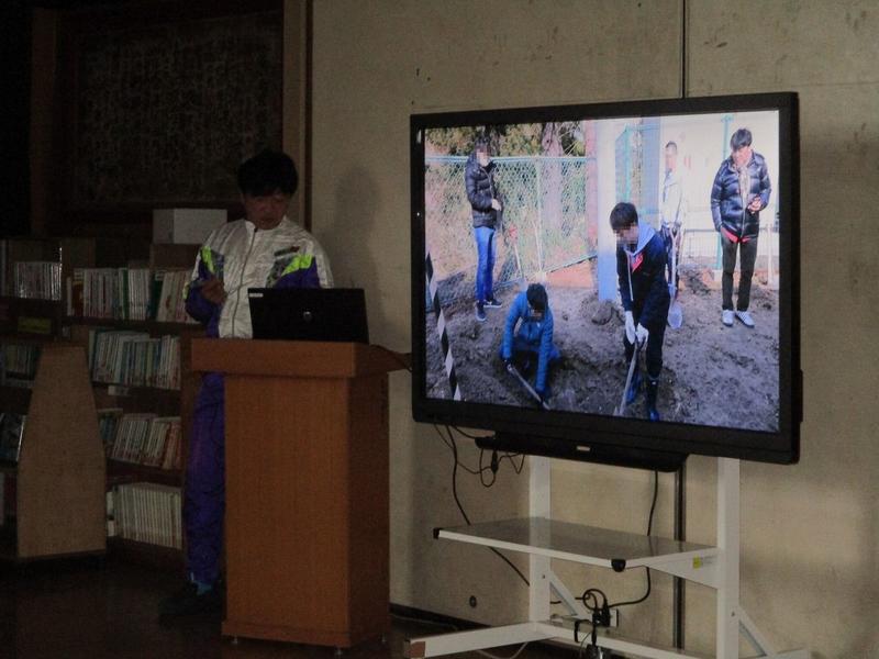 今日も、スライドショーを使って校長講話が始まります。この写真は26年前、校長先生が初めて卒業させた子どもたちが、タイムカプセルを埋めているときの写真です。卒業の記念に埋めました。
