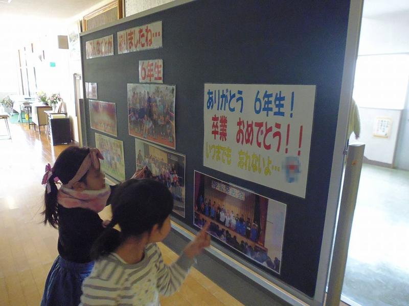 6年生の、1年生から今までの写真を、わずかばかりではありますが、職員室前に掲示して、全校生みんなでお祝いしています。
