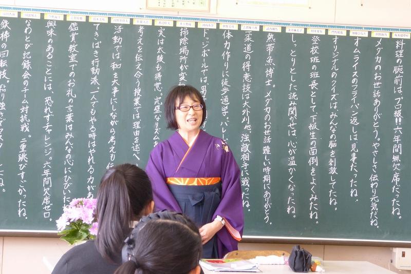 6年教室の黒板には、神長先生が心を込めて書いた一人ひとりへのメッセージがびっしり!2年間、本当にありがとうございました。