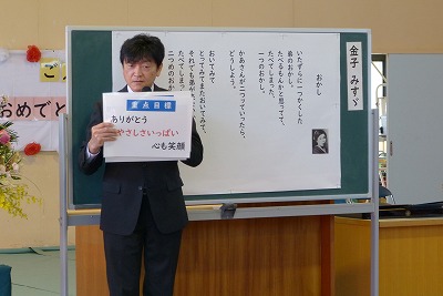 着任式では5名の先生方をお迎えしました。第1学期始業式では、校長先生が金子みすゞの「おかし」という詩をプレゼントしてくれました。