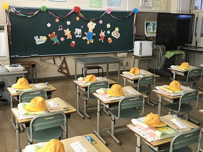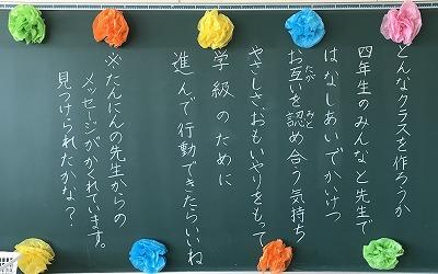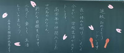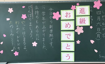 朝、教室では新しい担任の先生のメッセージが子どもたちを温かく迎えてくれました。