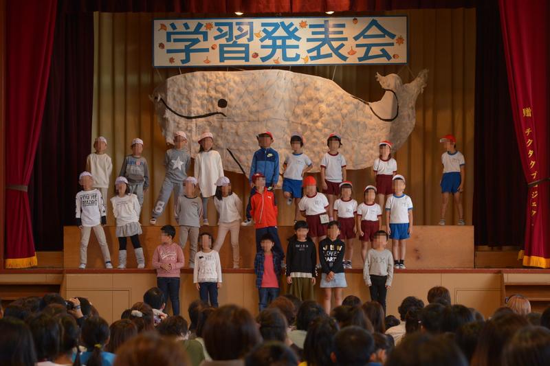 1年生の劇「くじらぐも in やわた」クジラ雲と仲良しになって,雲の上に乗って大冒険。観ている人をファンタジーの世界に引き込んでくれる,とっても楽しい劇でした。入学して早7か月。1年生の大きな成長を感じた発表でした。