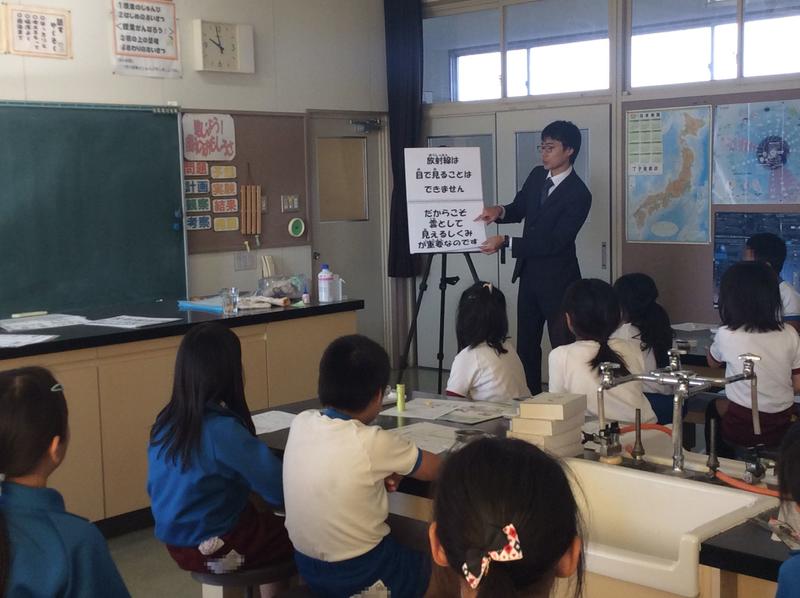 東京の科学技術館の加藤さんをお招きして,放射線教育の一環として,全校生が放射線について理解を深めることができました。測定器を活用しながら,放射線の特徴について様々な角度からとらえることができました。