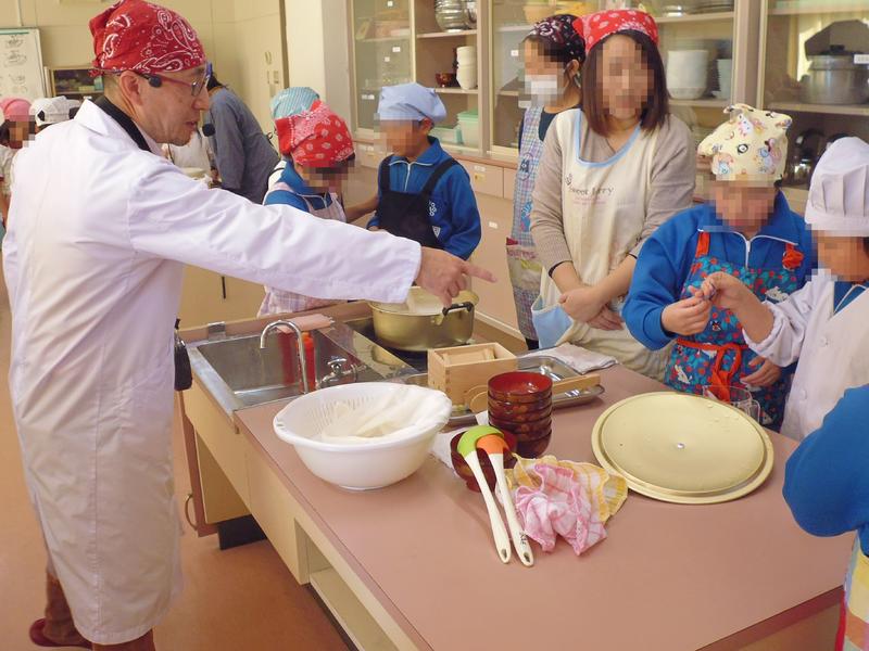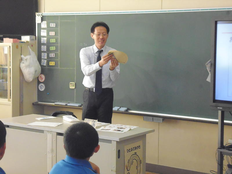 1年生教室で行われた食育の授業。栄養教諭の丹先生の紙芝居に,子どもたちは釘付け。好き嫌いなく食べることの大切さや,感謝の気持ちをもって食べる大切さなどを教えていただきました。このあと,親子でたのしく給食試食会を体験できました。八幡小の給食はおいしい!!と評判でした。