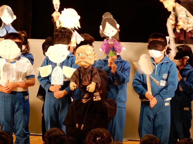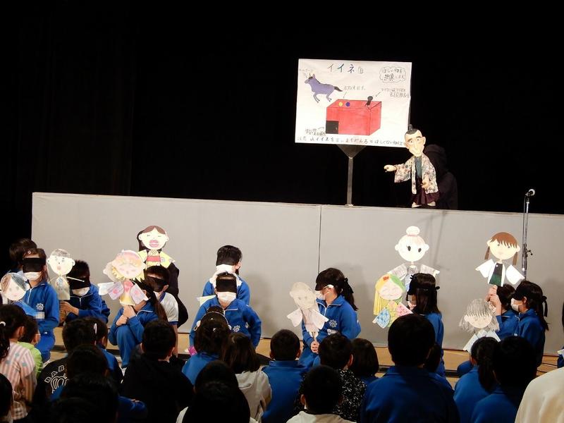 そこで活躍したのが,3,4年生。手作りの人形を手に,劇団の方々と一緒に人形劇に参加しました。