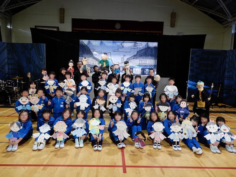 最後に記念撮影。みんな本当にいい笑顔!!文化庁による文化芸術子供育成総合事業ー巡回公演事業ーはとっても貴重な体験となりました。八幡っ子の心がとーっても豊かになりました。ありがとうございました!!