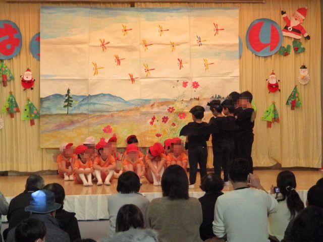 年長組の劇「とんぼのうんどうかい」では,敵同士だったとんぼとこうもりが最後に仲良くなるとっても心温まる劇でした。大きな声でセリフを言うことができました。