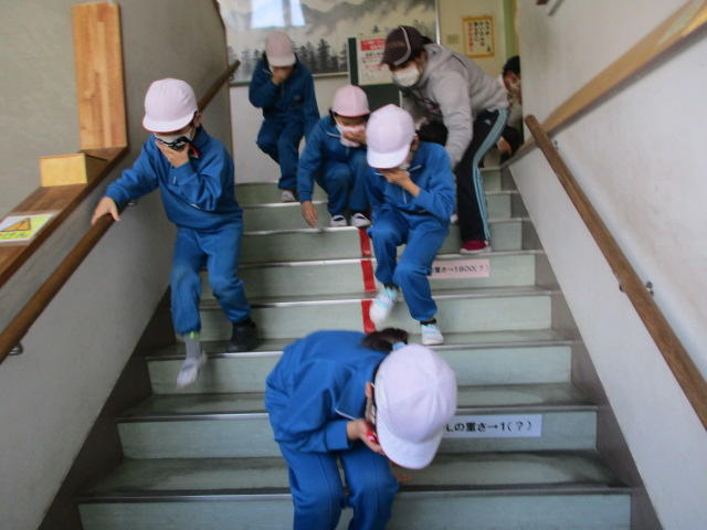 人が集まる昇降口では,立ち止まらずに,安全に注意して避難します。子どもたちはどこに避難すればよいのか,しっかり覚えています。自分の身は自分で守ることの大切さを再確認できました。