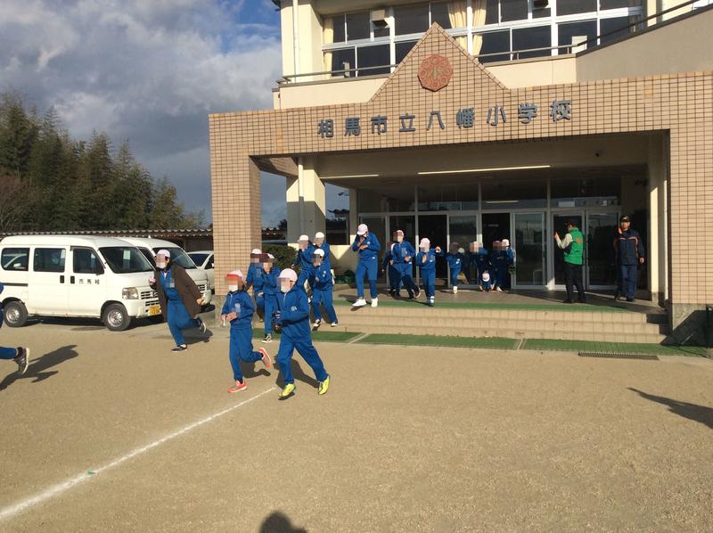 「訓練 訓練。ただいま,給食室より火災が発生しました。児童のみなさんは,担任の先生の指示に従い,校庭南側,児童クラブ前に避難しなさい。」