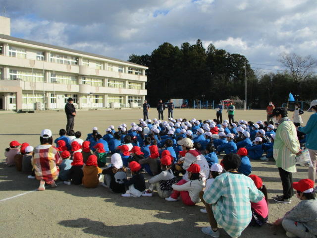幼稚園,小学校とも,校庭に全員避難終了!!全体会では,校長先生と,教育委員会の髙橋先生,そして相馬消防署の方のお話をいただきました。煙の怖さや性質,煙からの逃げ方など,詳しくわかりやすく教えていただきました。