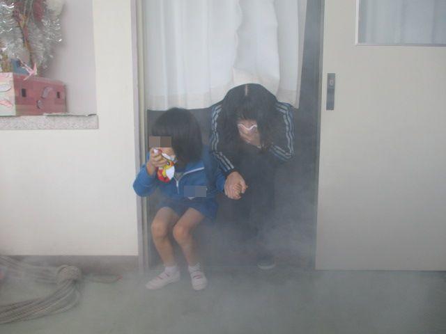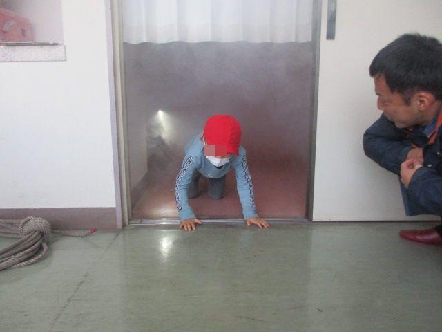 次は,煙体験。幼稚園も小学校も子どもたち全員,挑戦しました。場所は家庭科準備室。無害の煙ではありましたが,目の前が見えないとパニックになります。真っ白な部屋の中を,四つんばいになって,壁伝いに避難することができました。