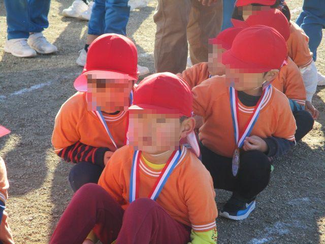 八幡幼稚園のみなさんも参加。がんばってトラック1周してゴール。首にメダルをかけてもらって誇らしげなみなさんでした。