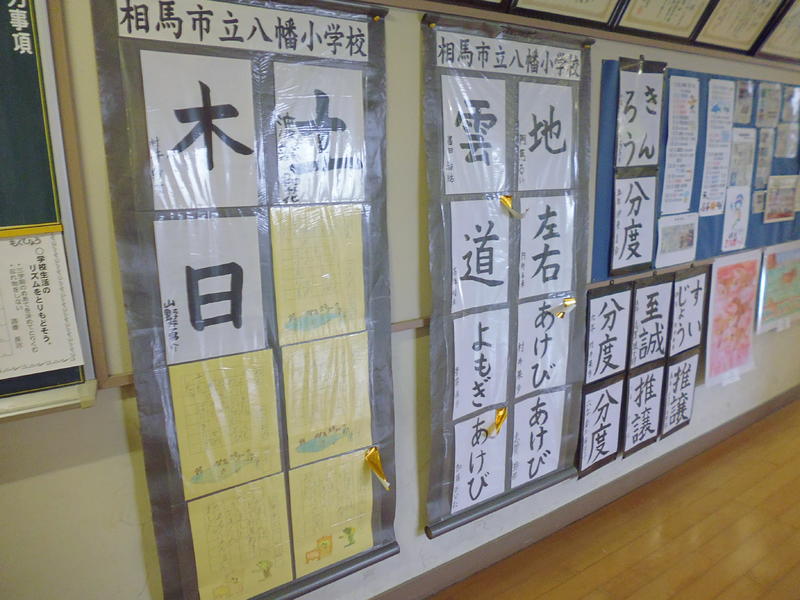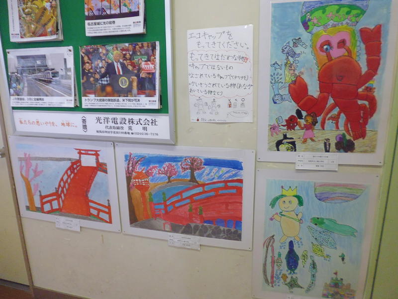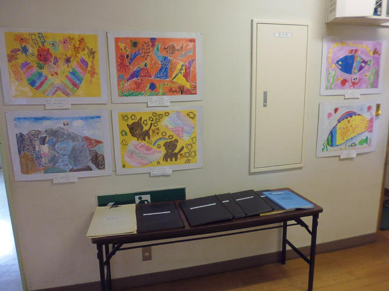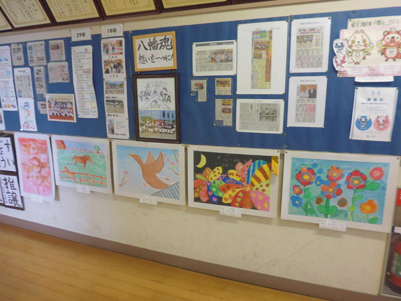 職員室前廊下には,市の展覧会に出品した子どもたちの作品が飾ってあります。