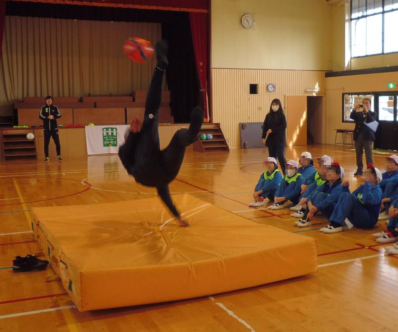 プロ選手のオーバーヘッドキックを目の前で披露していただきました。アクロバティックで力強い動きは,もはや芸術です・・・・・