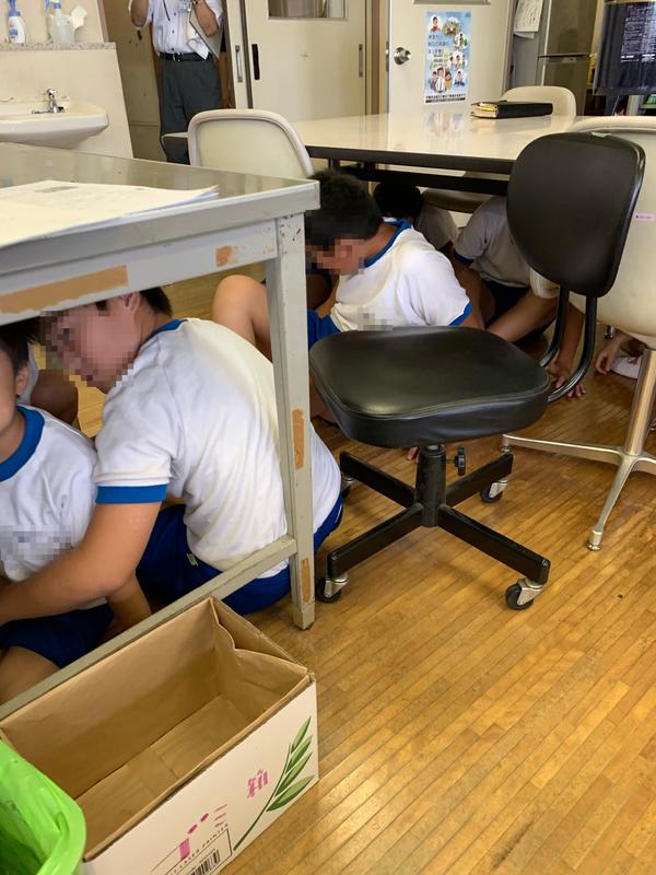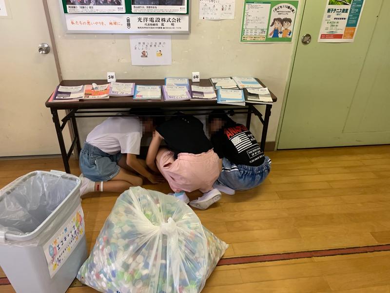 廊下にいた何人かの子は,職員室に入ってきて,先生方の机の下にもぐりました。(上)また,廊下の長机の下にあったエコキャップを退けてもぐりこむ子がいました。(下)