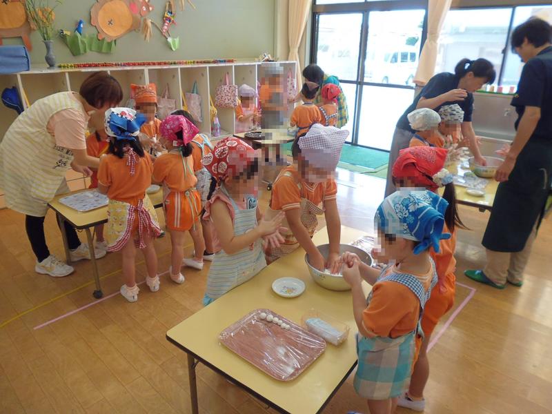 9月13日は中秋の名月。幼稚園では,相馬市で積極的に進めております「食育」の活動の一つとして,お月見会を開きました。今年もJAふくしま未来さんにご協力いただき,おだんご作りにチャレンジしました。