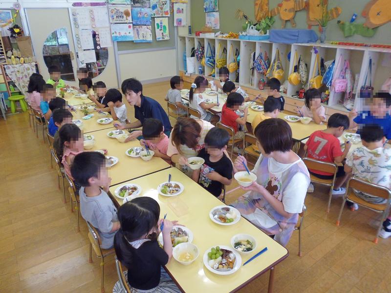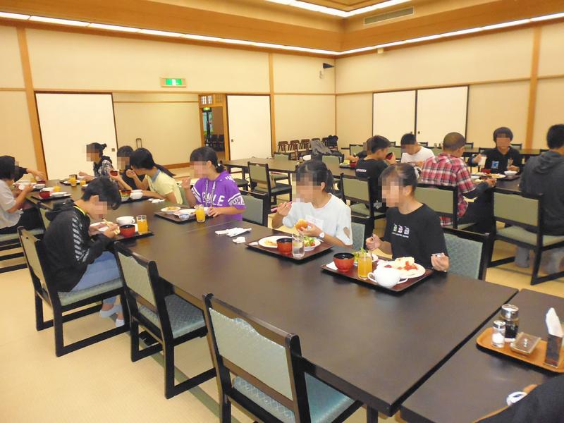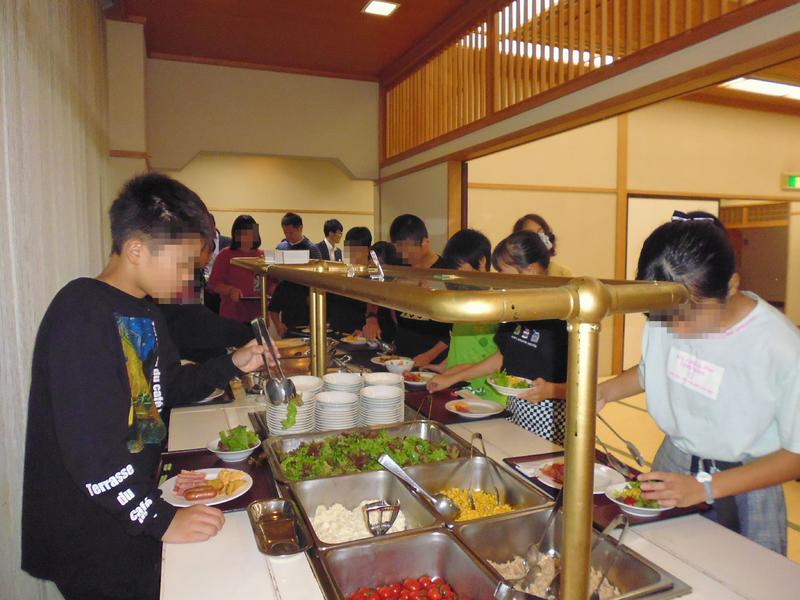 宿泊施設で,友と一緒に食べるご飯は最高ですね。笑顔笑顔笑顔がいっぱい。
