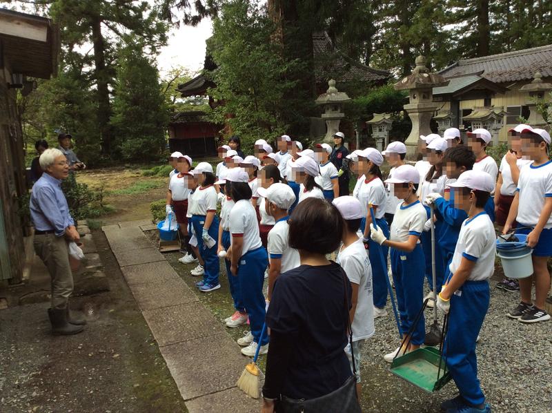 八幡神社の遠藤さんからお話をいただく5・6年生。八幡神社の歴史と伝統に誇りをもって,今日はピッカピカにするぞ!!