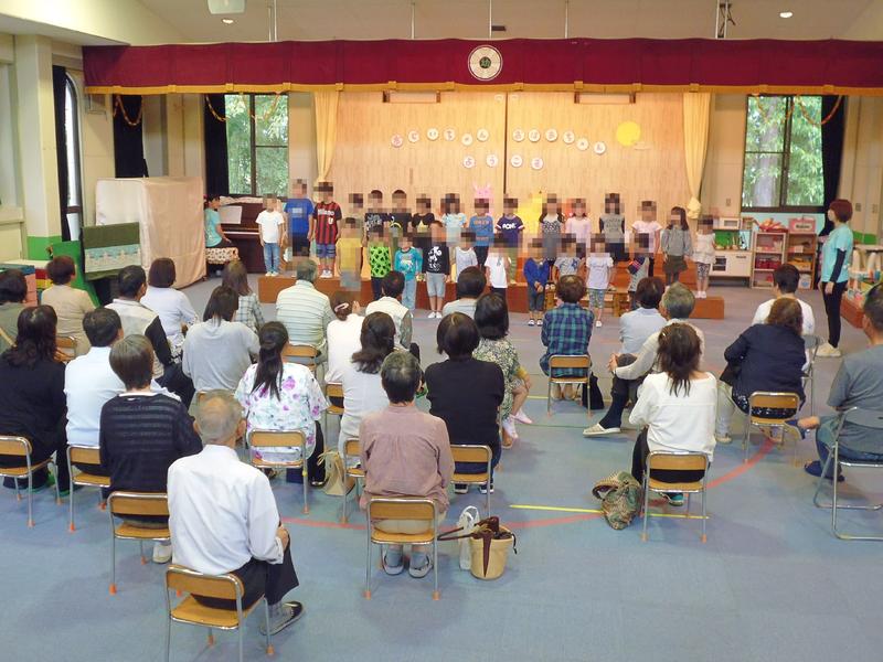 ホールでは子どもたちによる「とんぼのめがね」と「おじいちゃんもおばあちゃんも」の歌を披露しました。その後,手遊びやゲームを楽しんで・・・いよいよ