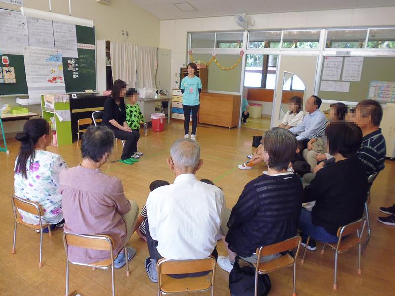 はじめに,紹介タイム。子どもたちがおじいちゃんやおばあちゃんの得意なことを発表した後,今度はおじいちゃんおばあちゃんが,子どもたちのよいところを自慢する会をひらきました。おじいちゃんおばあちゃんにほめられた子どもたちの表情はとってもステキで,うれしそうでした。ほめて育てる大切さをみんなで再確認しました。