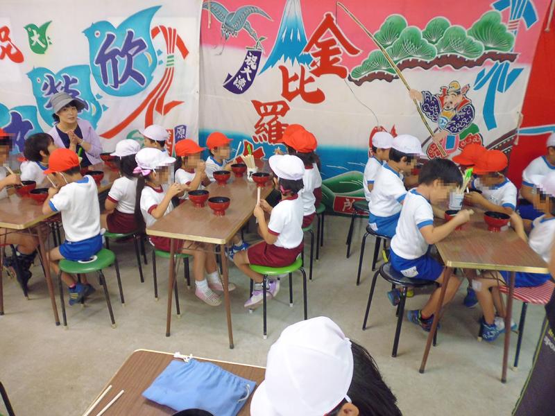 幼稚園から小学校へバトンタッチ。八幡小学校のみなさんも,学校行事の学習で例大祭に行き,あの有名な「いもずいも」をおいしくおいしくいただきました。