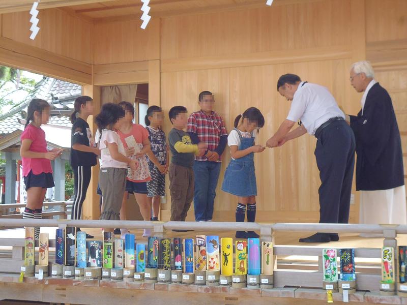 午後には,夏休みにがんばって作った竹灯籠の表彰式が開かれました。各学年の金賞と銀賞を受賞した子どもたちは,宮司の遠藤さんと総代長の草野さんから,一人一人入賞の商品をいただきました。八幡小のみなさんが作った竹灯籠は,例大祭の間,神社に展示されました。