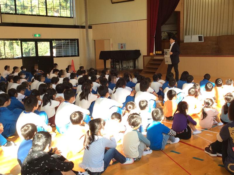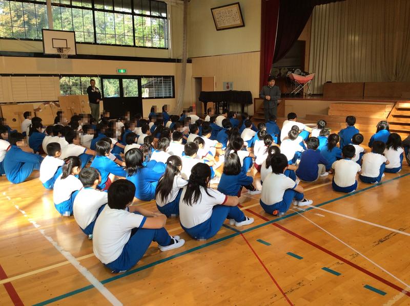 16日の朝。幼稚園,小学校の八幡っ子たちを体育館に集め,お互いに無事を確認し合いながら,安心して学校生活を送ることができるようにお話をしました。