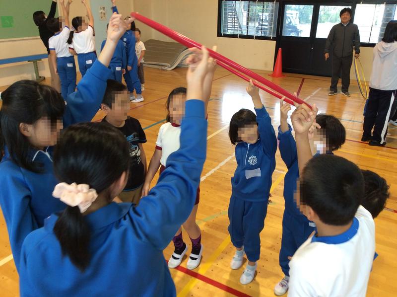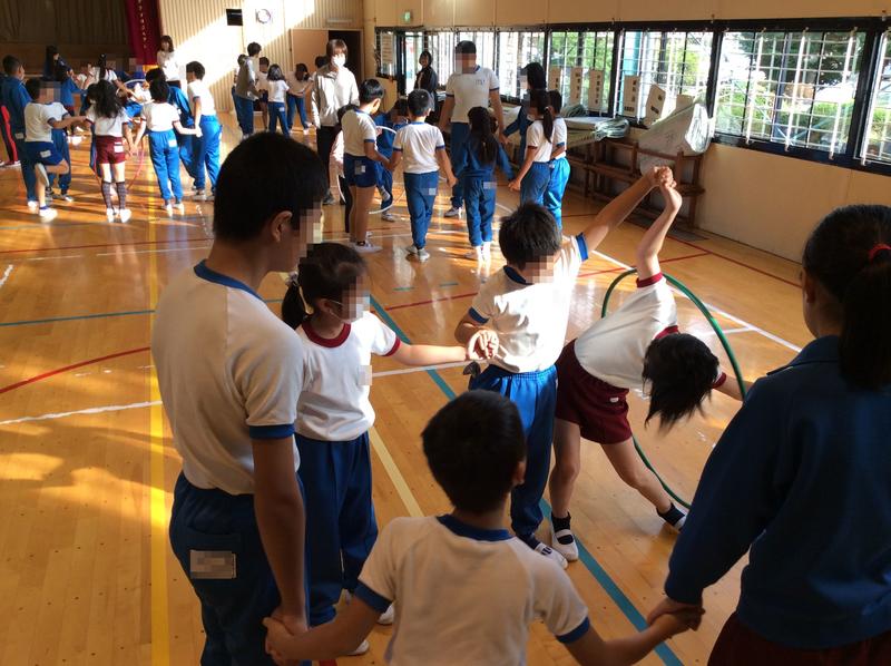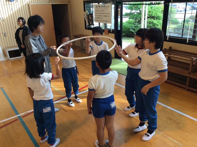 最後に,手をつないで,輪くぐり競走。手→足→頭→手 と次の人に体をくねくねさせながら,輪っかをリレーしていきます。なかなか難しいぞ。声をかけ合って,早く早く!!何と,びりっけつは先生方のチームでした。