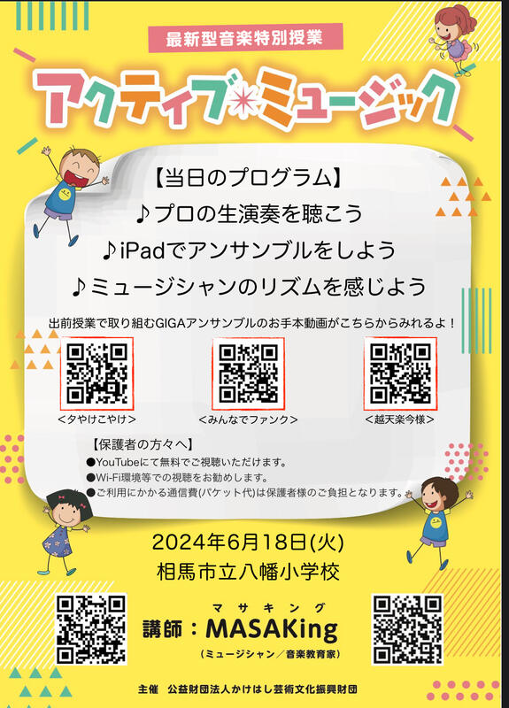 6月18日(火)にICTと音楽教育の第一人者であるマサキング先生が来校し、4・5年生児童と一緒にiPadを使ったアンサンブルを行います。