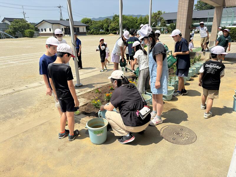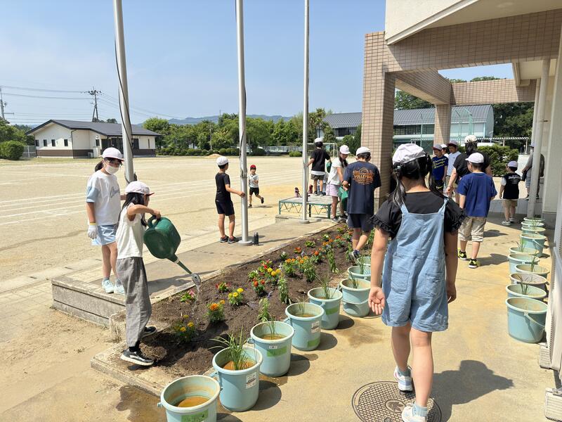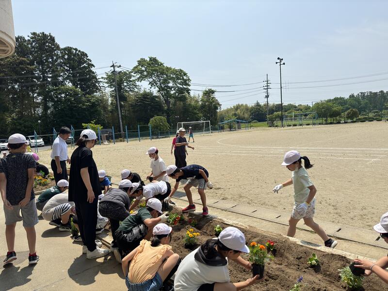 猛暑を避けて、業間休み時間に学級花壇の苗植えを行いました。