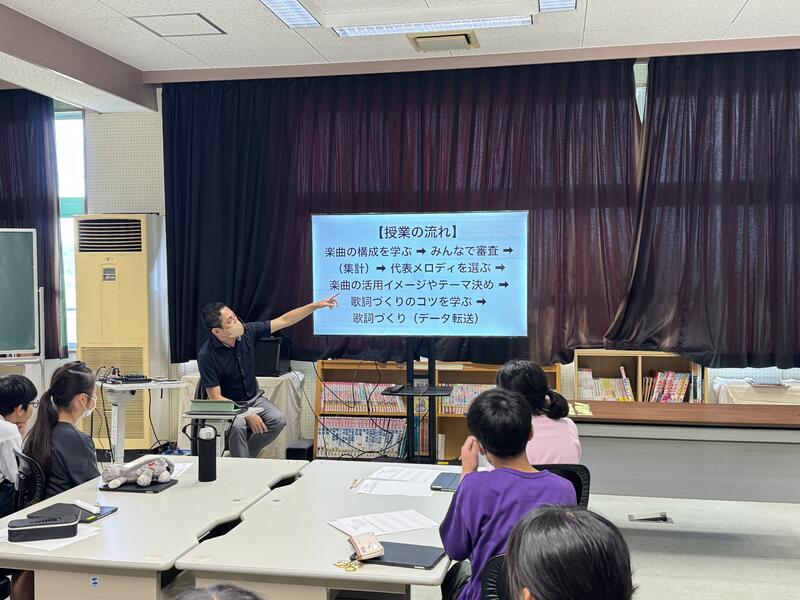 プロミュージシャンで音楽科でのICT活用の第一人者のマサキング先生が来校し、6年生に作曲のイロハと歌詞づくりのコツを教えてくださいました。