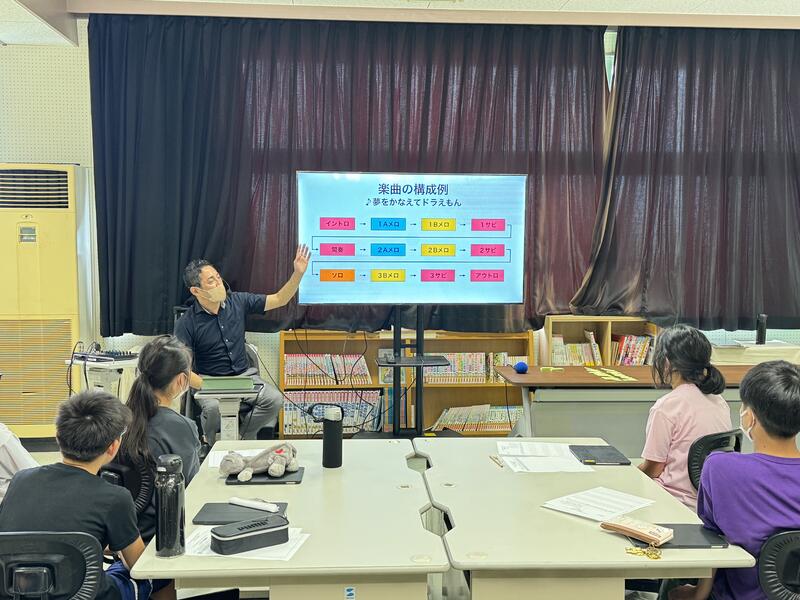 Aメロ、Bメロ、サビ、Cメロなど曲の構成、活用場面やテーマをもとにした歌詞づくりの大切さなど、具体的な例を挙げていただきなら、分かりやすく指導していただきました。