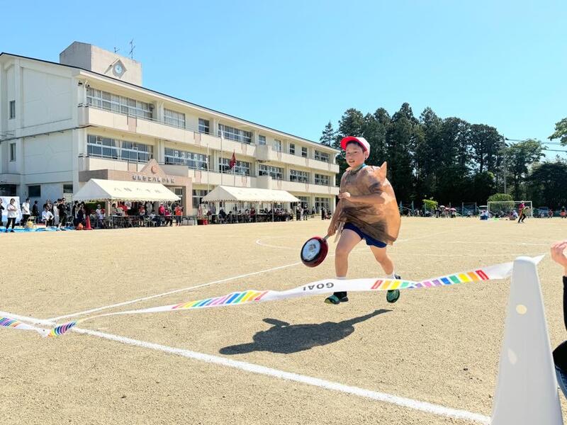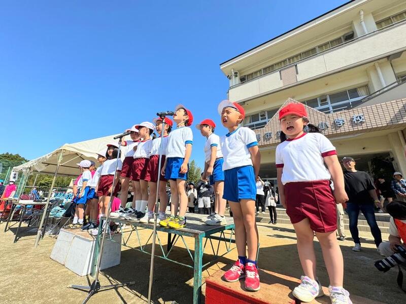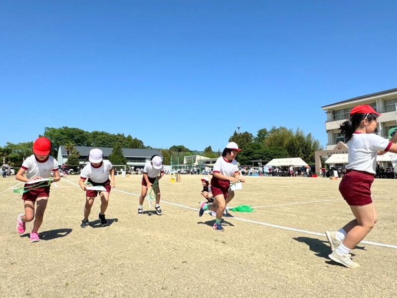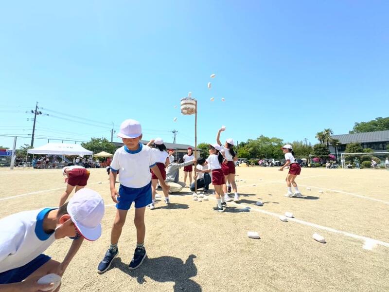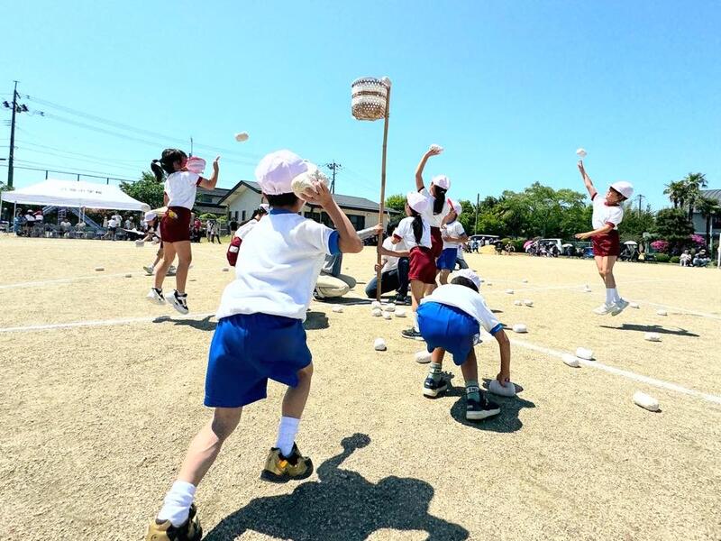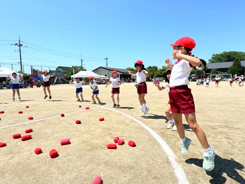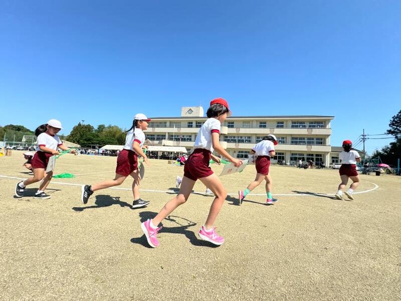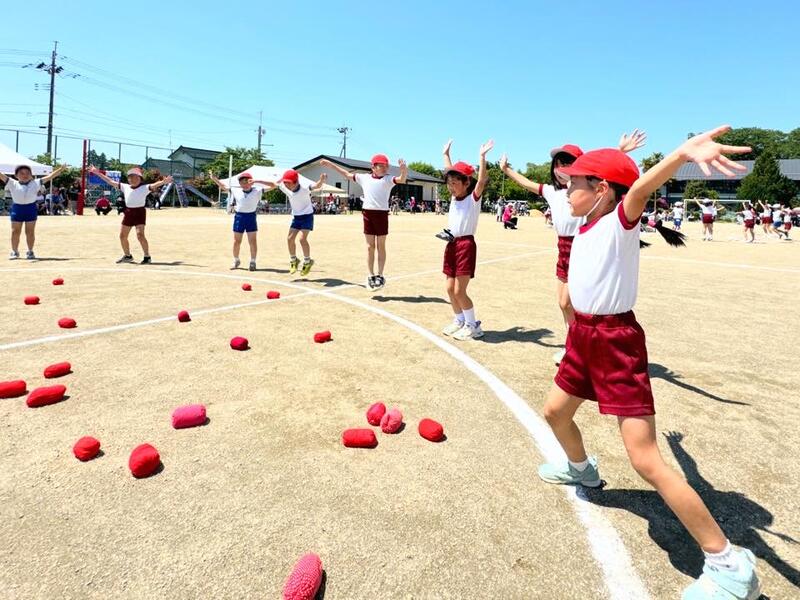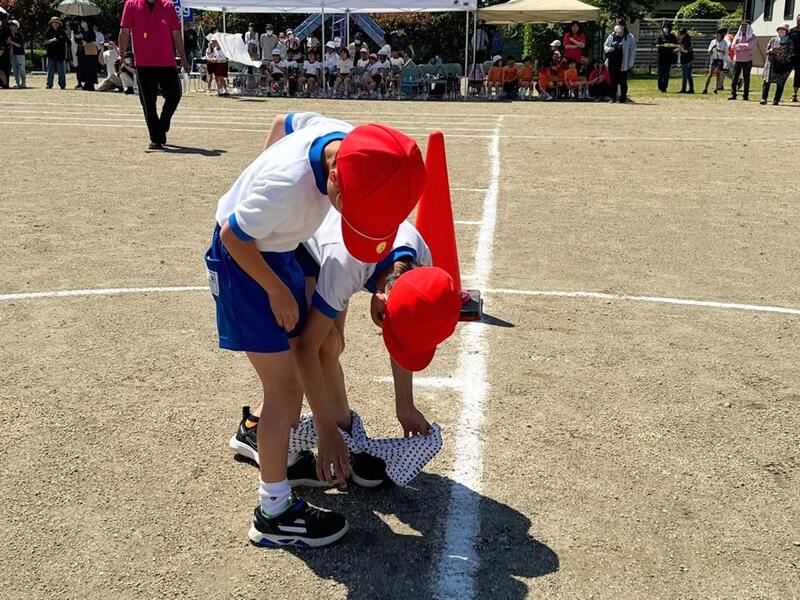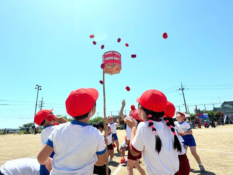 本校では1・2年生が、「チェッチェッコリ」の歌に合わせてオシリふりふり手足伸び伸びのダンスをしたり玉入れをしたりして競技を楽しむ姿が、観客もほっこりと楽しませてくれました。
