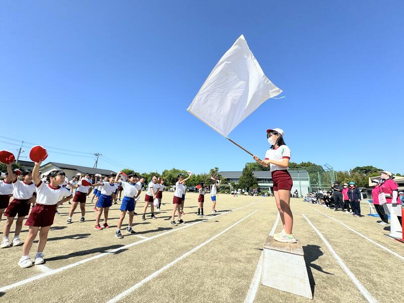 運動会の歌「ゴー・ゴー・ゴー」では、6年生が応援旗を大きく振りながら、甲乙付け難いほど白熱した歌による応援合戦が披露されました。