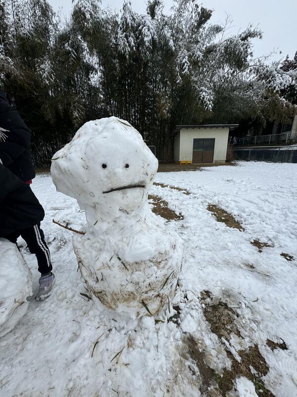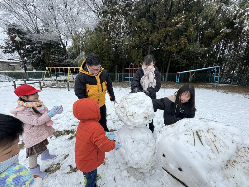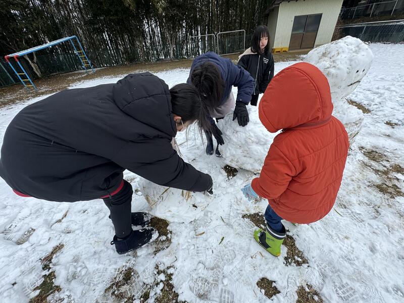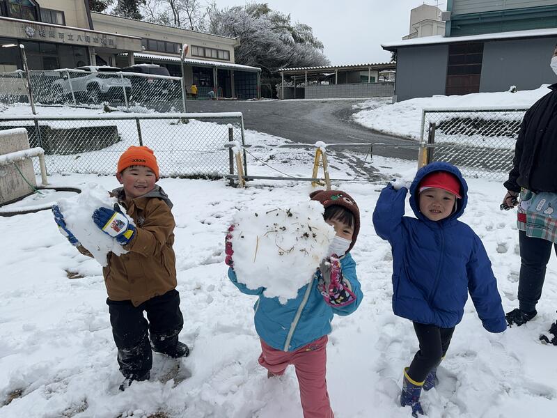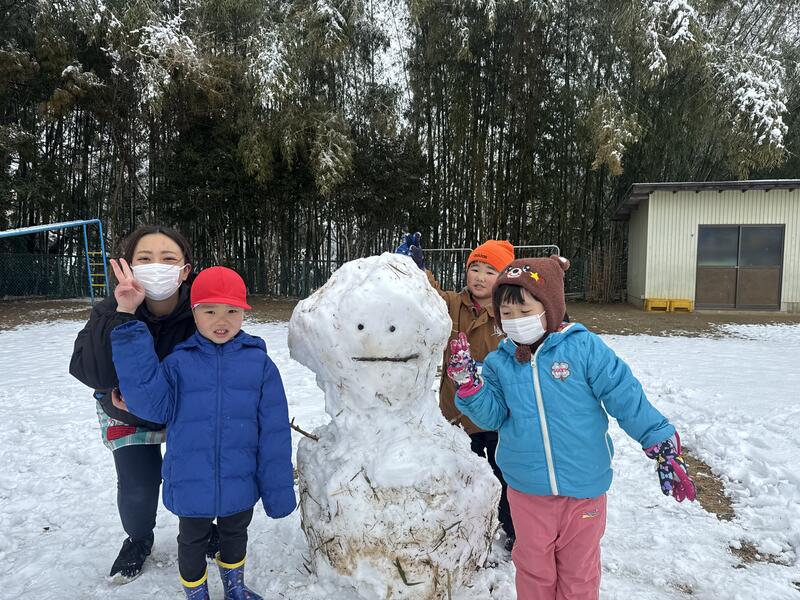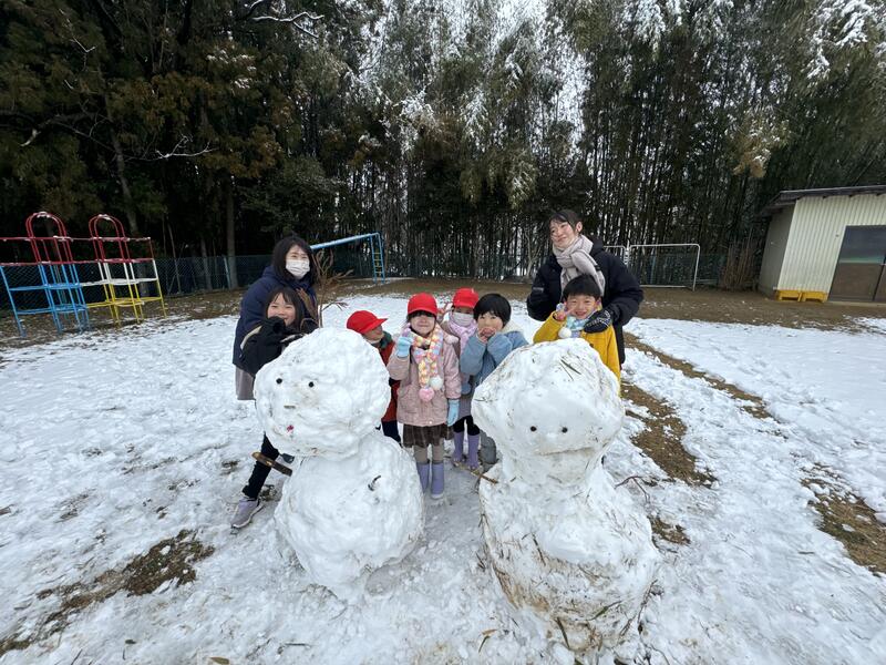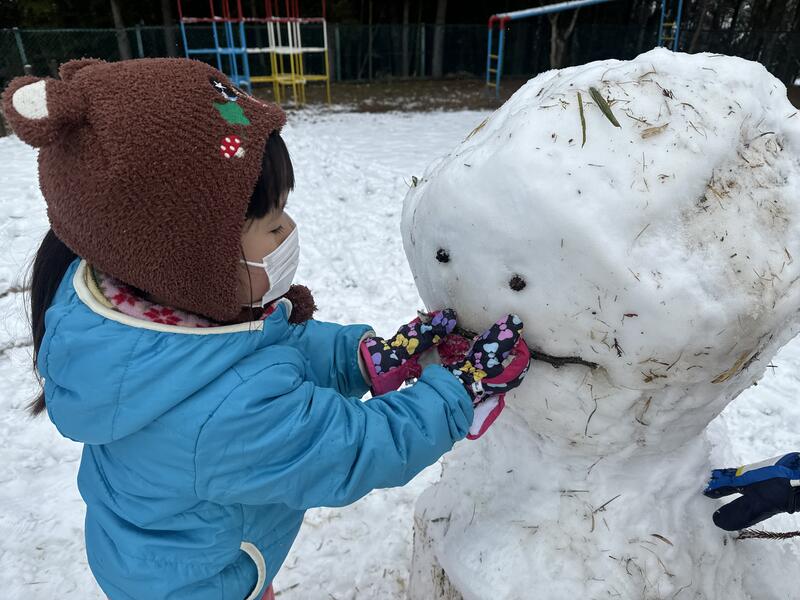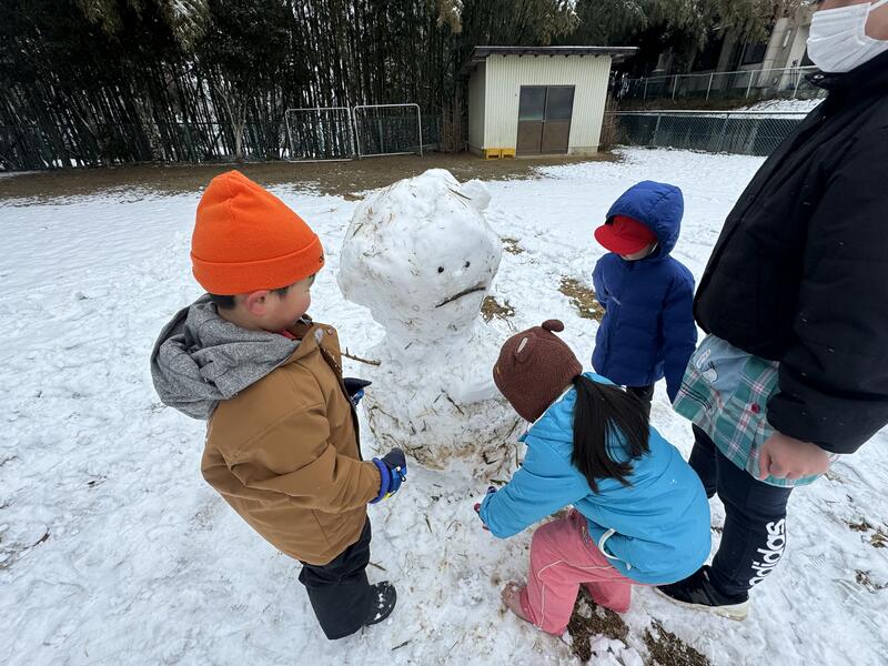この季節特有の湿った雪でしたが、園児たちみんなで協力して可愛い雪だるまを2体も作ることができました^_^