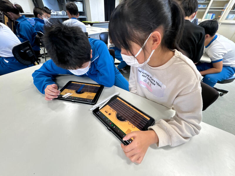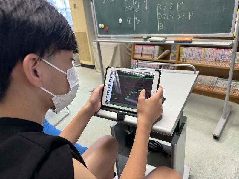 はじめ操作に戸惑っていた子どもたちも、次第に慣れて最後は基本のコードにピアノでメロディーをつけることができました。