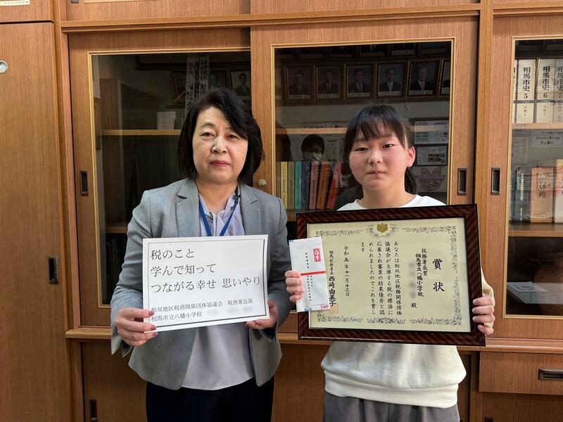 本校6年生が、相双地区税務関係団体協議会が主催のする「税の標語コンクール」で、税務署では賞に選ばれ、本日校長室にて表彰していただきました。