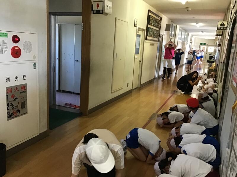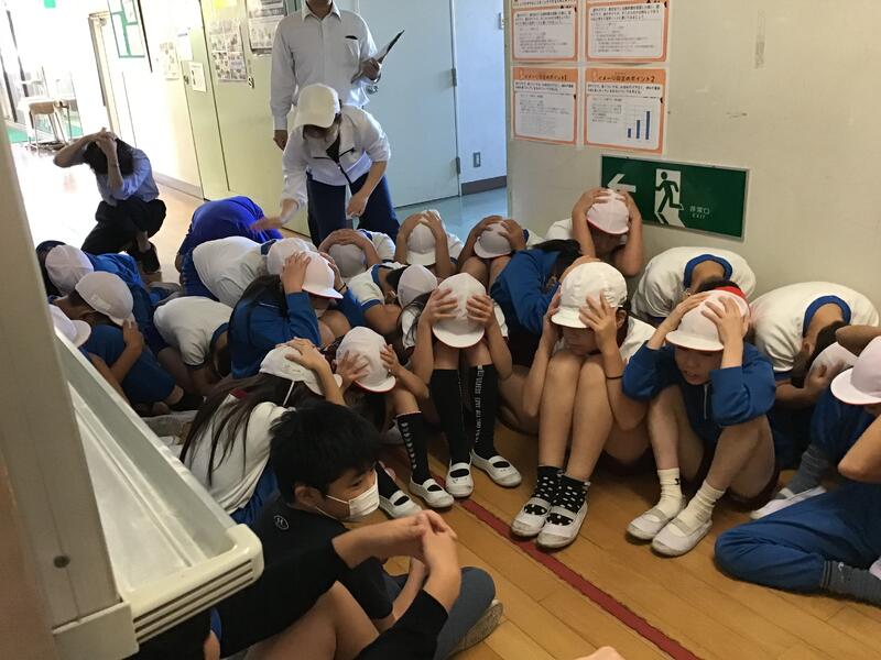 Jアラート音が流れ、日本上空をミサイルが通過するという想定で行い、児童は避難場所である職員室前に静かに避難することができました。