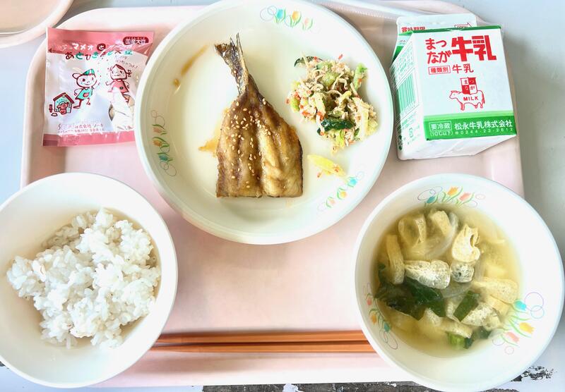 本日の献立は麦ごはん、牛乳、いわしの蒲焼き、ごま酢和え、新たまねぎのみそ汁、あとひきみそ大豆の5品。