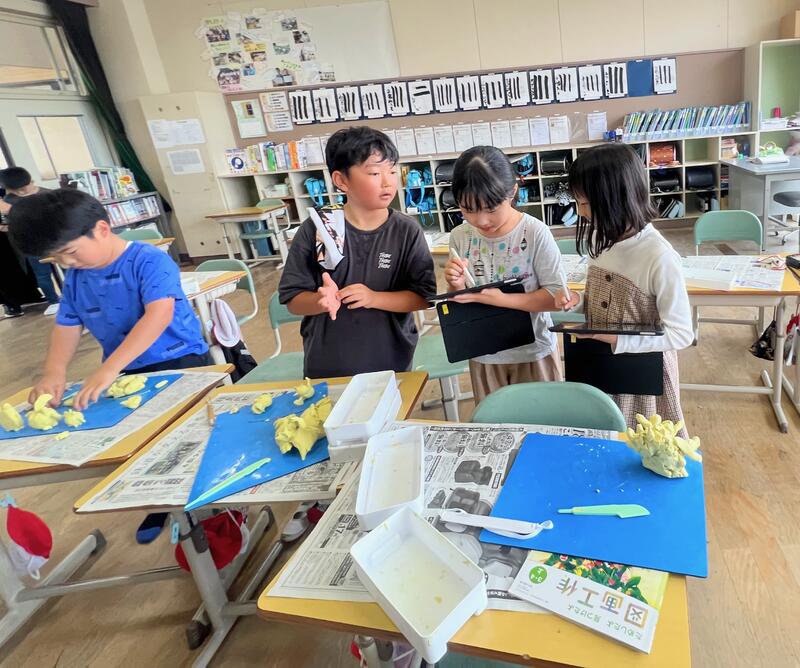 3年生の図工では、粘土を使っていろいろな形を自分なりに生み出し、自分だけの作品を仕上げる単元に取り組んでいます。