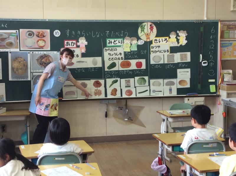 中村第一小学校の栄養教諭の先生を講師にお招きし1年生に栄養教室を実施していただきました。食べ物を赤・黄・緑と働きごとに分類し、好き嫌いなく食べることの大切さを学びました。