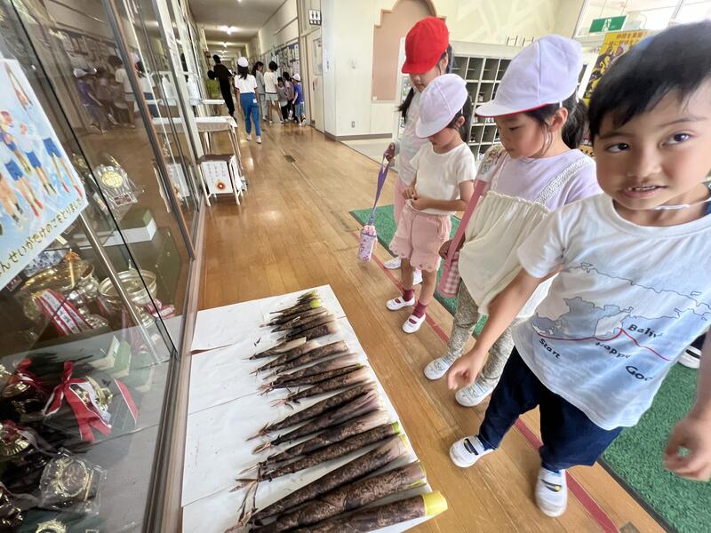 収穫した竹の子は、児童昇降口前廊下に展示し、全校生に観てもらいました。
