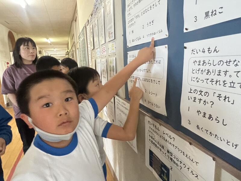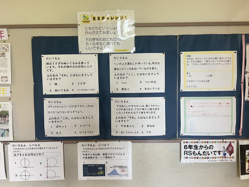 6月はリーディングスキル強化月間として、職員室廊下に先生方や6年生が作ったリーディングスキルクイズを掲示しています。