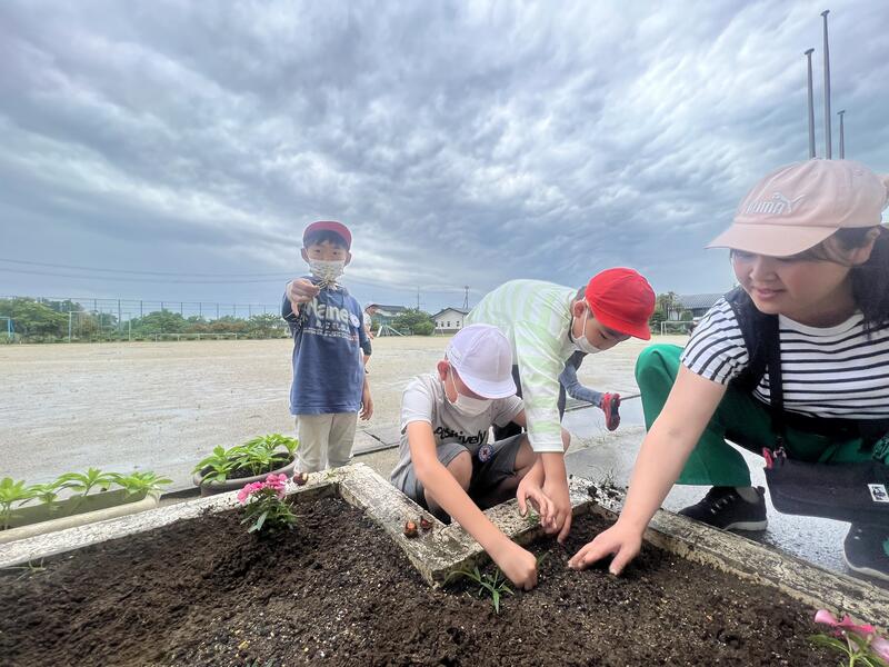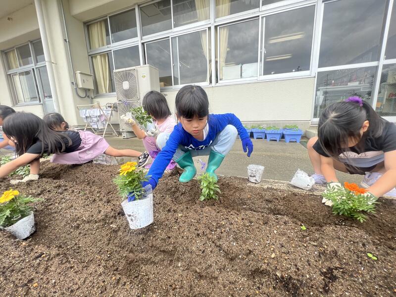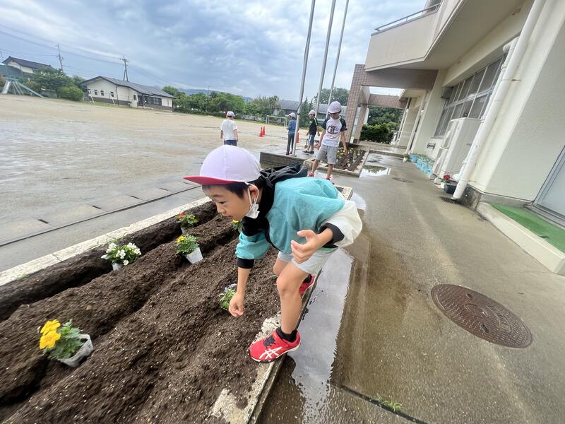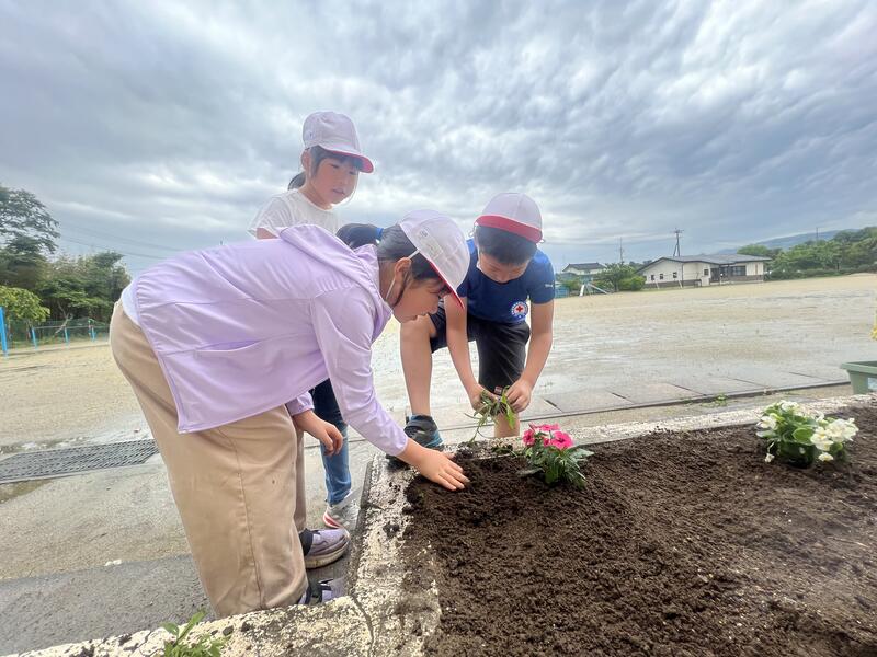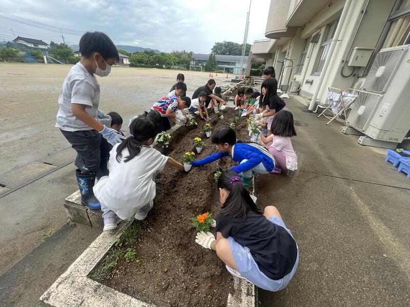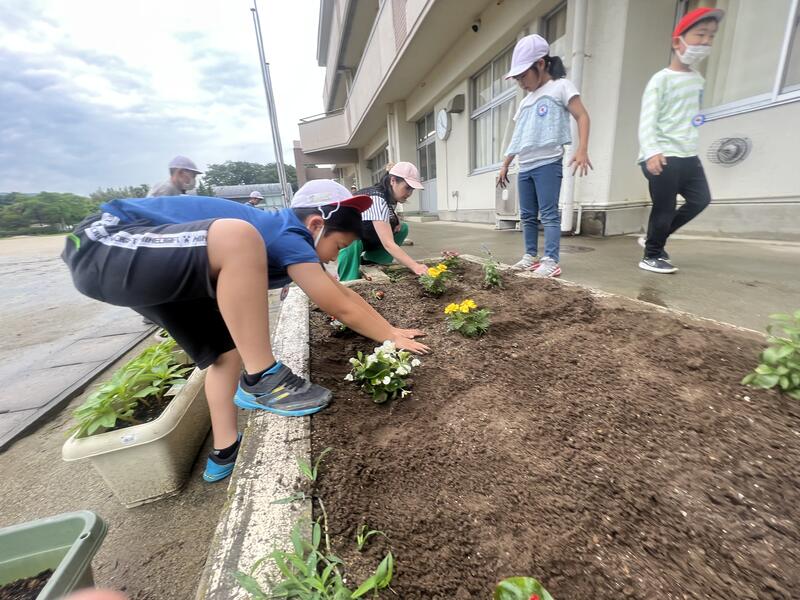 本校児童だけでなく、送迎や授業支援で学校を訪問さられる地域の方々に、花のある環境を楽しんでもらいたいと願いながら、丁寧に苗植え作業に取り組みました。