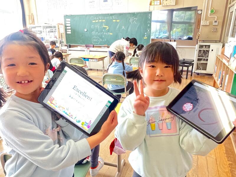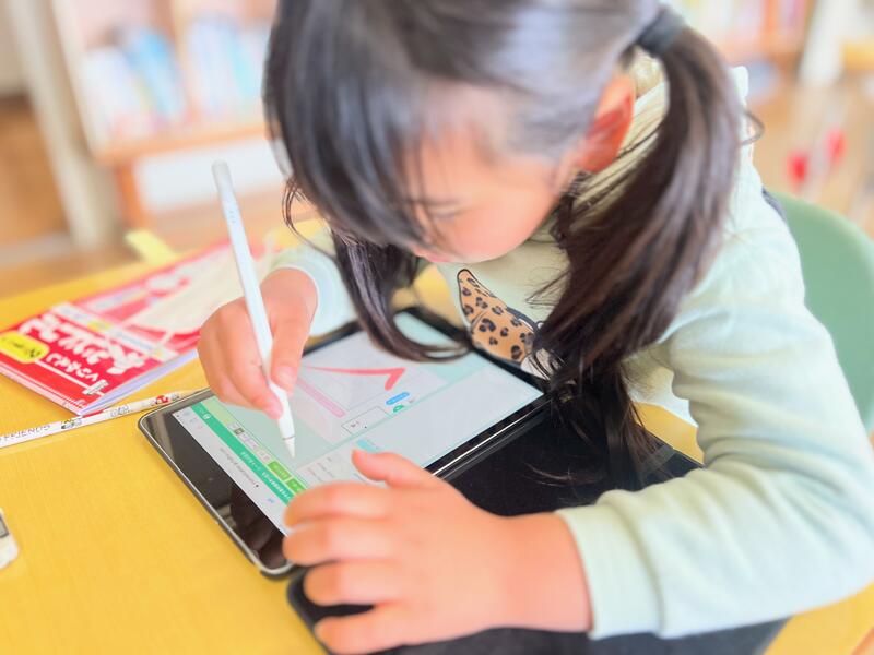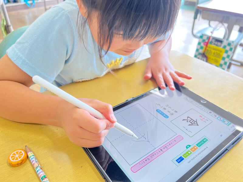 2年生の漢字の書き取り練習の場面です。タブレットの漢字練習は、書き順・止め・はね・はらいが厳密で、正しく書かないと正解にはなりません。