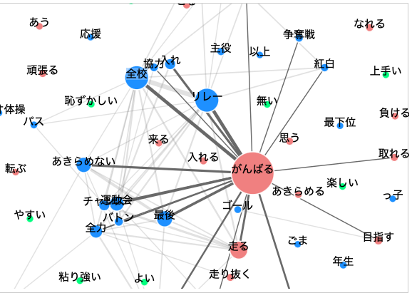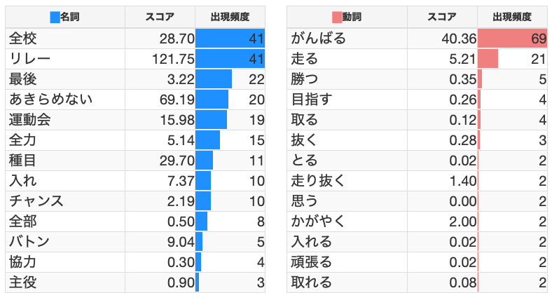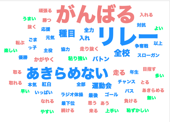 「 全校」と「リレー」というキーワードがそれぞれ41回、「最後」と「あきらめない」が22回、20回表出する結果となりました。その中でも、一番多く表出したキーワードが「がんばる」で69回でした。