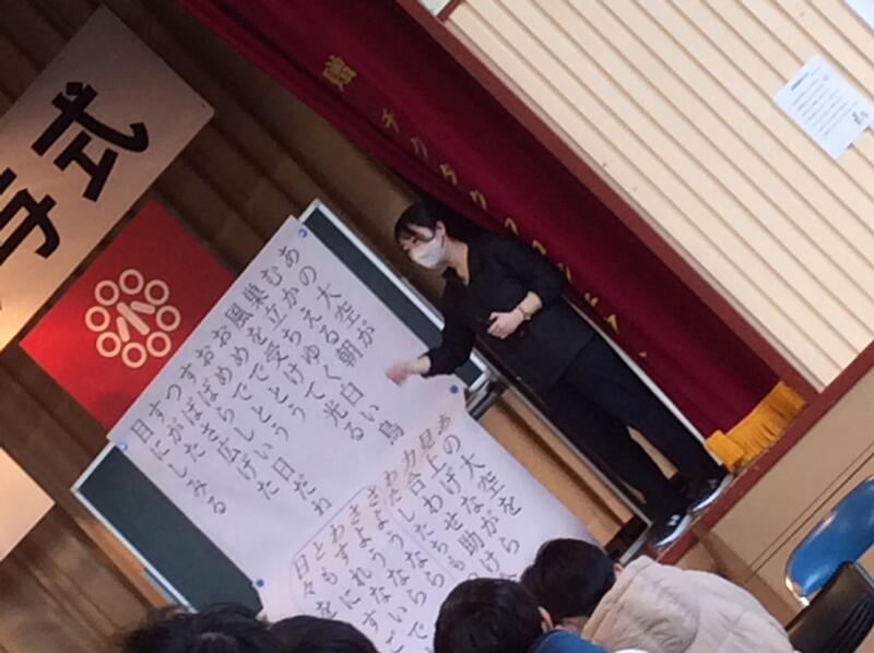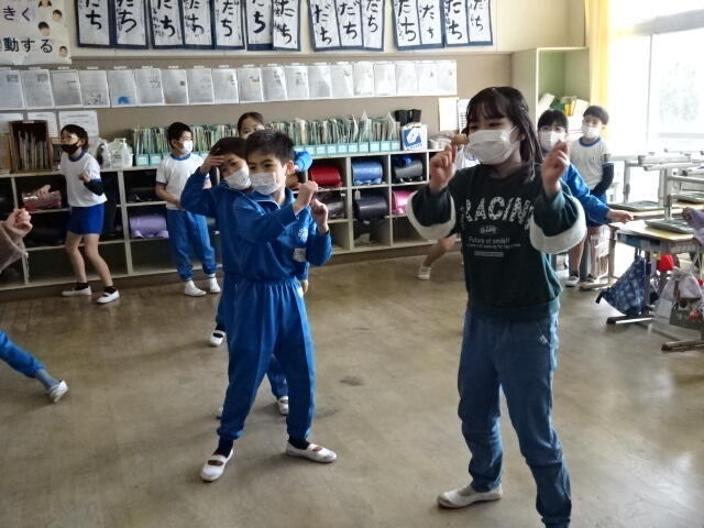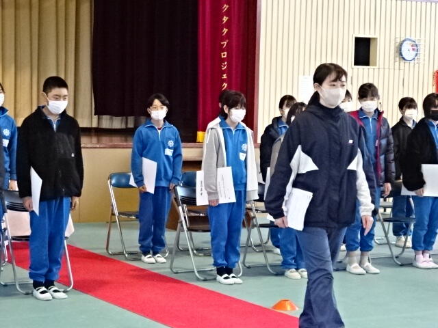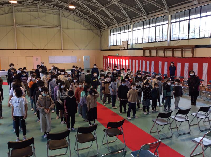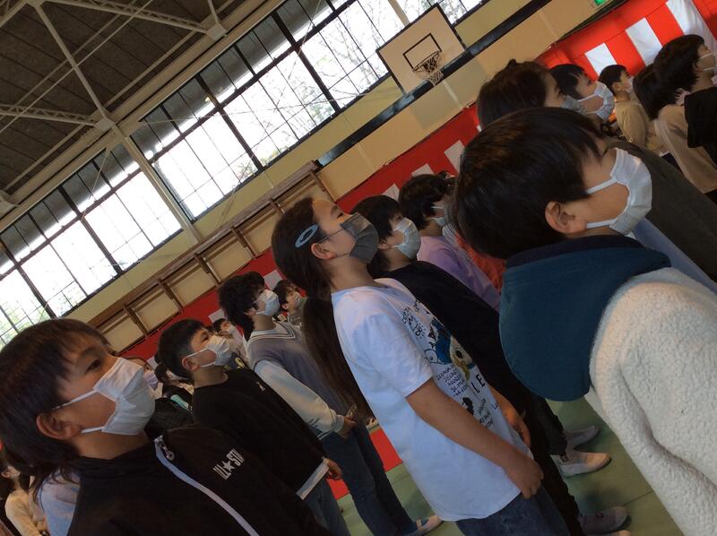 3月15日(水)の3校時、1年生から5年生までの児童が体育館に集まり、「大空が迎える朝」の歌の練習をしました。