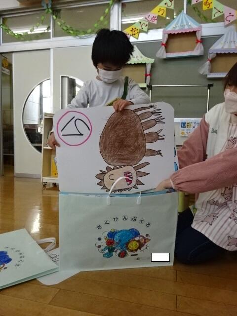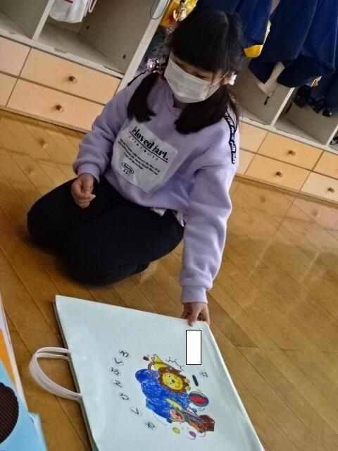 自分で色を塗った作品ぶくろに作品を入れていました。