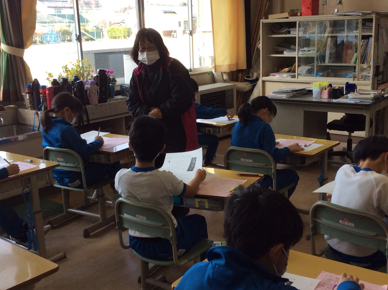 振り返りでは、担任の先生から「1年間前の自分と比べてできるようになったことやがんばったことを書きましょう」との声かけがあり、子どもたちは、自分ががんばったことを見つけて書いていました。